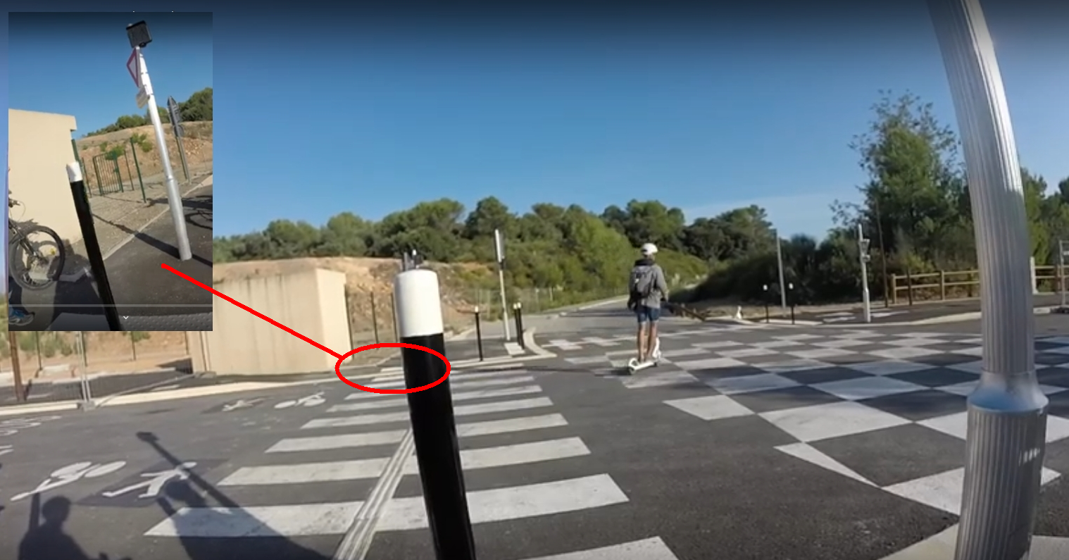 Prenons l’exemple de l’intersection en bas du campus SophiaTech : en suivant les pictogrammes « vélo », les cyclistes doivent faire deux tournants à angle droit, slalomer entre les poteaux implantés sur le trottoir, franchir une bordure… Heureusement, la visibilité est bonne et le trajet choisi par la personne à trottinette sur la photo ci-dessous, tout aussi légal.